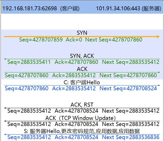 客户端发送ClientHello包后(https, TLS握手阶段),中间的旁路设备阻断了客户端,代替服务器向客户端回复了RST报文(但未向服务器发送RST),导致服务器认为会话未中断,还在继续发送后续ServerHello数据包:
